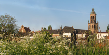 Zicht op het centrum vanaf de ten oosten daarvan gelegen Rijndijk.